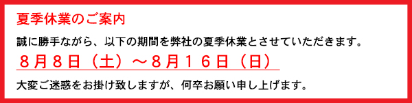 【夏季休業のご案内】8月8日(土)〜8月16日(日曜)